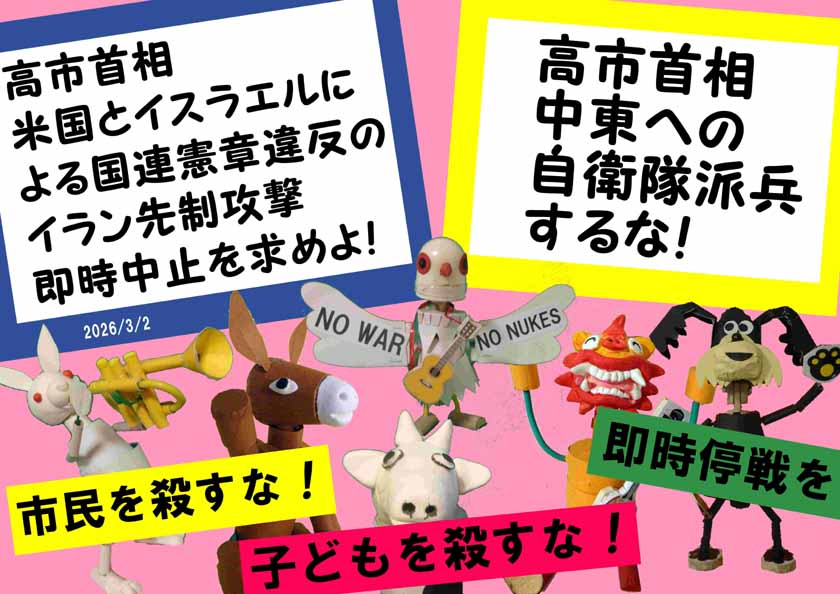 更新:2026/03/03__11:00 投稿を掲載しました。詩を追加しました。展覧会情報更新 緊急! トランプとネタニヤフはイランの小学校を爆撃し 多数の小学生が殺害されたそう。悪魔の所業。 国際社会はアメリカとイスラエルを断罪せよ! 2国間協議交渉中に突然武力攻撃とは非道の極み。 日本政府は中立の立場を貫け! サナエ! トランプの手先になるな! ![]() 3月1日はビキニデー←クリック 平和を守る党が必要 アメリカ・イスラエルによる 国際法違反のイラン攻撃は国連も、多くの 法学者も批判していますが日本の各政党はトランプの顔色をうかがって いるのか、明確な批判は避け、高市政権支持を表明。侵略・攻撃された 側のイランを批判する政党は多数。嘆かわしい限り。 国際法違反の武力攻撃 を明確に批判しているのは 共産と れいわだけ。 高市政権が改憲で戦争に突き進もうとしている中、断固戦争反対を貫き、 平和を守る党が必要です。 中間選挙で支持率下降中のトランプが敗北する可能性もあるのに トランプの 忠犬サナ公 に成り下がるのは考えものです。 武力による他国領土強奪は許されず。 イラン攻撃を行うトランプ政権もプーチンと同罪。 ![]() ![]() |