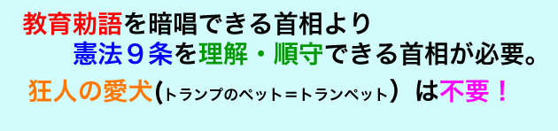 更新:2026/03/21__15:30 伝言板 更新 危険で有害な無能世襲防衛大臣 (お馬鹿シンちゃん) トランプが中国も含む他国に護衛艦を出すように要求。 世襲4世防衛大臣は「中国まで護衛艦を出したら、何も しない日本は世界から取り残され笑い者になる、と。 現実は真逆で世界各国は護衛船派遣を拒否。狂人大統領は 怒って「支援不要」と主張を一転。 自分で侵略戦争を仕掛けておいて身勝手極まりない態度。 世界の世論は国際法違反の戦争に協力を拒否。 国際情勢も読めない、愚かな世襲大臣、危険で有害です。 人殺し武器の輸出を可能にする 「5類型撤廃」 を維新の 前原共同代表が提出。 日本を戦争国家に改造中。 前原は、高市や野田佳彦と同じ パナソニック製政治家。 松下政経塾出身の政治家、 「平和の敵」 ばかり。 ![]() ![]() 平和を守る党が必要 アメリカ・イスラエルによる 国際法違反のイラン攻撃は国連も、多くの 法学者も批判していますが日本の各政党はトランプの顔色をうかがって いるのか、明確な批判は避け、高市政権支持を表明。侵略・攻撃された 側のイランを批判する政党は多数。嘆かわしい限り。 国際法違反の武力攻撃 を明確に批判しているのは 共産と れいわだけ。 高市政権が改憲で戦争に突き進もうとしている中、断固戦争反対を貫き、 平和を守る党が必要です。 中間選挙で支持率下降中のトランプが敗北する可能性もあるのに トランプの 忠犬サナ公 に成り下がるのは考えものです。 武力による他国領土強奪は許されず。 イラン攻撃を行うトランプ政権もプーチンと同罪。 ![]() ![]() |